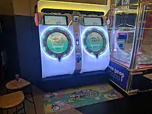 The defining feature of maimai's arcade cabinet is its striking resemblance to a front-loading washing machine.[9] Early advertisements and promotional materials had different joke catchphrases sprinkled in, such as "It's not a washing machine!" and "No water." At its first deployment test, maimai had "NO WASHING" written on its cabinet. Early in development, the original concept was actually a music player, instead of a rhythm game. Up to 2 players can play per cabinet, and up to 4 players can play together with more cabinets. The motherboard can be accessed using the back door on the player 2 side. The original design was made in collaboration with Electronics manufacturer Sharp in Sega's maimai LIVE 2014 Washing Festival event.[10][11][12]