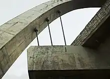The bridge is a post-tension box girder structure with the center pier as an arch support straddling the road.[2] Used in lieu of a center support, the arch is 110 feet (34 m) wide[2] and 75 feet (23 m) tall.[3] Six cables measuring four inches (102 mm) in diameter run from the arch to the main structure of the bridge at the center.[3] The two ends of the reinforced concrete arch are connected to each other underground using a post-tension tie beam, making the structure a tied arch.[2]