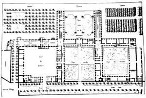 The domaine of Saint-Cyr was assigned to the Maison in 1685, and the king ordered[2] major building work on the domaine next to Versailles, led by Jules Hardouin Mansart.[5] The project cost the king 1,400,000 livres.[5] Hardouin-Mansart's designs for the Maison used the U-shaped plan he often used elsewhere, with the buildings reserved for the mistresses and students forming an H, to which the school chapel had to be added to the west. The classrooms and students' dormitories were on the first and second floors respectively, the dormitories just above the classrooms for the corresponding classes. Each dormitory held 40 beds and was surrounded by two cells for the mistresses. Each classroom was also juxtaposed with a small supplementary dormitory with 20 beds, itself next to two cells for the mistresses. The infirmary was sited away from the dormitories to allow the sick to be isolated and thus avoid the spread of contagious diseases.[2] The rooms reserved for pensionnaires were situated to the east of the buildings, to put them as far as possible from the visitor entrance, situated to the west at the level of the external courtyard.