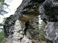 The Malá Pravčická Brána (German: Kleines Prebischtor) is a natural sandstone arch, that is about 2.3 m (7.5 ft) high and 3.3 m (11 ft) wide. It is located in Bohemian Switzerland near the red signposted main hiking route (E3 European long distance path) between Mezní Louka and Vysoká Lípa.