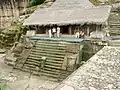 Cuauhtinchan Archeological Zone or Malinalco Archeological Zone, located just west of the town center on a hill called Cerro de los Idolos, which rises 215 meters above the town.[1] On its sides are a number of pre-Hispanic structures built on terraces built into the hill. The main structures are at the top.[2] This is one of the most important Aztec sites and was discovered in 1933,[3] and explored by José García Payón in 1935.[4] The visible complex dates from the Aztec Empire but the site's use as a ceremonial center appears to be much older.[4] The sanctuary complex was built from the mid 15th century to the beginnings of the 16th. To get to the Cerro de los Idolos one must climb 426 stairs up 125 meters.[5] Along the stairway leading to the site, there are signs with area's history written in Spanish, English and Nahuatl. The site contains six buildings.[6] The Cuauhcalli or House of the Eagles, which dates from 1501,[7] is the main building, which is significant in that it is carved out of the hill itself.[3] The building is in the shape of a truncated pyramid,[8] built this way due to the lack of space on the hill.[2] The monolithic Cuauhcalli has been compared to the Ellora in India, Petra on the shores of the Dead Sea and Abu Simbel in Egypt.[4] This was a sanctuary for the Eagle Warriors for rites such as initiation.[3] A thirteen-step staircase leading into this temple is flanked by side struts.[4] and two feline sculptures that face the plaza in front.[8] The Cuauhcalli consists of two rooms, one rectangular and the other circular, with an opening in the wall between the two. After being carved out of the rock, the walls and ceiling were covered in stucco and painted with murals, most of which are almost completely gone.[2] In the upper part, the entrance is symbolized by the open jaws of a serpent, complete with fangs, eyes and a forked tongue, which was painted red.[4] This upper portion is covered by a thatched roof of the grass the area is named for.[8]