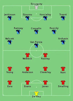 The match kicked off at around 16:00 GMT in front of a crowd of 75,448 at Manchester United's stadium, Old Trafford.[6] United opened the scoring in the 22nd minute, when Welbeck beat Djourou to a scooped pass from Anderson and headed the ball past Szczęsny.[6] Arsenal had a chance to level the scores five minutes later, when they were awarded a penalty for a foul on Walcott by Evans; however, De Gea correctly guessed the direction of Van Persie's penalty kick and pushed the ball around the post.[7] A minute later, Traoré could only clear a cross from Rooney as far as Ashley Young, who controlled the ball, shifted it onto his right foot and curled a shot into the top corner to score his first goal for Manchester United since signing from Aston Villa that summer.[8]