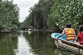 It is possible to navigate, by kayak or canoe, the waterways inside the mangrove forest in the zone accessible to tourists (137,5 hectares = 4,61% of the sanctuary).[2] In this area activities like walking on beaches, birdwatching and observation of the use of the mangrove ecosystem by the locals are also allowed.[2]