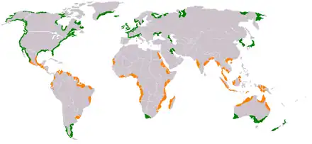 Mangroves can be found in 118 countries and territories in the tropical and subtropical regions of the world.[21] The largest percentage of mangroves is found between the 5° N and 5° S latitudes. Approximately 75% of world's mangroves are found in just 15 countries.[21] Estimates of mangrove area based on remote sensing and global data tend to be lower than estimates based on literature and surveys for comparable periods.[9]