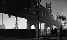 The famous bridge shot was done at five in the morning.[18] The production had to bring their own bench as there were no park benches at the location.[19] The bridge had two sets of necklace lights on a timer controlled by the city. When the sun came up, the bridge lights went off. Willis made arrangements with the city to leave the lights on and that he would let them know when they got the shot. Afterward, they could be turned off. As they started to shoot the scene, one string of bridge lights went out, and Allen was forced to use that take.[18]