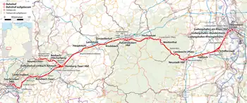 During the German rail reform, the line became the property of Deutsche Bahn on 1 January 1994. From 1995 onwards, Neustadt (Weinstr) Böbig halt, which is located in the eastern area of Neustadt Hauptbahnhof, could be served by trains on the Ludwigshafen–Neustadt line, although previously it had only been served by trains on the Palatine Northern Railway.[64] In 1996, VRN tickets could be used as far as Kaiserslautern.[60] From 1993 to 1999, the number of passengers on the Weidenthal–Neustadt section rose from 1500 to 3270 per day.[65] Neidenfels station went into operation between Lambrecht and Weidenthal in 1998. In May of the same year, the Federal Government and Deutsche Bahn signed a financing agreement worth 351.4 million DM to upgrade the line between Mannheim and Saarbrücken. This work was expected to be completed by 2004.[66] The first stage saw an upgrade for tilting trains with a top speed of 160 km/h. The tracks on the St. Ingbert–Kirkel and Neustadt an der Weinstraße–Ludwigshafen sections are now ready for a line speed of 200 kilometres per hour.[67] A bypass was built, which has allowed long-distance passenger and freight trains to bypass Schifferstadt since 2003.