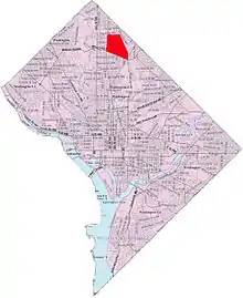 The National Capital Planning Commission's 1967 "District Communities" map indicates that the neighborhood is roughly bounded between 8th Street NW to the west, North Capitol Street NW, Blair Road NW, and the Red Line train tracks to the east, Rittenhouse Street NW to the north, and Missouri Avenue NW to the south. Manor Park borders the adjacent neighborhoods of Takoma, Brightwood, Brightwood Park, and Riggs Park neighborhoods. In 1940, the Manor Park Citizens Association deemed the boundaries to be Eighth Street, Whittier Street, North Capitol Street, and Concord Street (now named Missouri Avenue).[1]