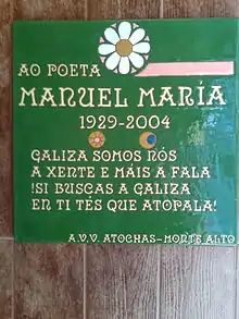 Manuel María Fernández Teixeiro, better known as Manuel María (October 6, 1929, Outeiro de Rei–September 8, 2004, A Coruña), was a Spanish poet and academic who wrote in the Galician language. He was notable for his combative character and his political commitment.[1][2] His poetry touched on themes of love, art, his own political commitment, drawing attention to wrongs, ethnography, physics, history, immateriality, mythology, the animal world, poetic expression, the passing of time, religion, society, language, agricultural labour, urbanism, and geography. The Day of Galician Literature was devoted to him in 2016.[3]