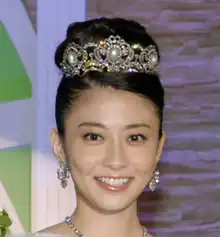 During an interview for News Zero, she met kabuki actor Ichikawa Ebizō XI.[3] On 19 November 2009, they announced that they were dating with the intent of marriage and were to be formally engaged sometime in December 2009.[4][5] The couple registered their marriage on 3 March 2010 and held their wedding reception at The Prince Park Tower on 29 July 2010.