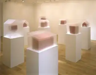 In exhibitions including solos at The Project and Knoedler & Co. (2002, 2006), González expanded her formal repertory in less overtly autobiographical and more theatrical directions.[8][5][27] The first show conveyed a mood of unease and suppressed emotional energy that centered on a fragile, ominous-looking electrical tower structure that was repeated in hand-altered photographic negatives, a small glass sculpture, and a silhouette traced on paper with fingernail clippings.[8] The second show, titled "Internal DupliCity," presented nine minimal, blood-red architectural forms set atop white pedestals and encased in cubes of frosted plexiglass partly obscuring them that Holland Cotter characterized as "a phantom city, familiar but inaccessible, filtered through mist." The structures—based on memories of Renaissance villas, agrarian sheds, burial vaults and churches seen during a Rome fellowship—conjured associations with Catholic reliquaries, dollhouses and longtime themes of loss and remembered or imagined homes.[5][3][28]