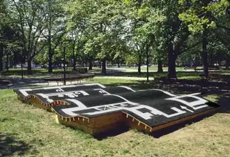 In several projects, González explored similar themes by mapping the architectural floor plans of homes onto minimalist forms using outlines akin to blueprints.[7][8][9] For the site-specific outdoor sculpture Magic Carpet/Home (1999/2003/2017)—installed in parks in Red Hook, Brooklyn, Pittsburgh and Los Angeles—González painted the plans of local public-housing units onto undulating wood platforms surfaced with recycled rubber playground material.[7][9][1] Critics noted the work's unusual juxtapositions—pointed social commentary, "high" modernist allusions (to artists such as Carl Andre) and broad appeal—which transformed grim social realities into a wavy flying carpet evoking fantasy and imagination.[7][9][26] Peter Schjeldahl described the work's LACMA presentation (2017) as "laconically unsettling" in its superimposition of cramped quarters on a playground structure in a grassy park.[26]