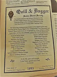 Later in 2016, the Cornell Daily Sun reported that Moreno was inducted as a member of the 125th tapping class of Quill and Dagger, one of the oldest honor societies in the Ivy League. Membership of this once secretive society is now publicly available, with the names of all newly tapped Quill and Dagger members published in Cornell's newspaper, in addition to a book of enrollment available on Amazon.[25] Little is known about the organizations current day privileges or practices,[25] though they are rumored to exert significant influence over the Cornell community and U.S. Government.[26]