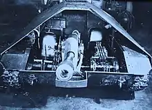 Afterwards, a workshop within the Rogifer Works was made available for the construction of three more prototypes: M-01, M-02, and M-03.[14][39] They were all enlarged and reinforced, with the latter being 43.2 cm wider and 13.4 cm longer than the T-60 tank.[40][41] These were completed by mid-October 1943 and were progressively modified to fix problems shown by M-00.[34][42] M-01 was the last one to use the T-60 chassis; later prototypes used Rogifer-built ones.[43] Construction methods were modified to use welding rather than riveting and the interior compartment was divided using a bulkhead.[34] The prototypes had a crew of two, positioned in the front compartment: a driver-aimer-gunner on the right and a commander-loader-radio operator on the left.[44][45] The former was situated more frontally, which is also shown in photographs.[34][46]
