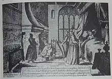 Representations of the legend have been shown outside the church. For example, in the guest house Het wapen van de Prins van Oranje ("the coat of arms of the Prince of Orange"), a picture by Pieter van den Keere, showing Margaret of Henneberg giving birth, was on display. This painting was also commonly printed in the 17th century and is now in the abbey church of Loosduinen. It shows a kind of chest with drawers on the left, on which there is a bowl with many children, and a smoking chimney. In the center, midwives are busy with bed sheets and hot water; on the right in the bed, the mother is shown.