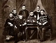 Grand Duchess Maria Alexandrovna was born on 17 October [O.S. 5 October] 1853 at the Alexander Palace in Tsarskoye Selo.[1][2] She was the sixth child and only surviving daughter among the eight children of Emperor Alexander II and his first wife, Empress Maria Alexandrovna (née Princess Marie of Hesse and by Rhine).[3][4] At the time of her birth, her grandfather, Nicholas I, was on the Russian throne and her father was tsarevich. In 1855, when Maria was seventeen months old, Nicholas I died and her father became the new Russian emperor.[2] The Grand Duchess grew up as the only girl with four older brothers and two younger ones.[2] She did not know her only sister, Alexandra, who had died before she was born.[5] Maria herself almost died from a throat disease at the age of seven.[6]