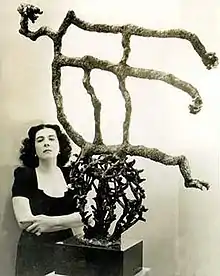 In 1939, her husband Carlos became the Brazilian ambassador to the United States, moving their family to the States.[3] During her US residency from 1939 to 1949, Martins studied with the sculptors Jacques Lipchitz and printmaker Stanley William Hayter.[2] Lipchitz introduced her to bronze casting and encouraged exploration of Surrealism and her Brazilian roots.[4] She evolved to using the Egyptian lost-wax casting technique as her creative process of choice.[5] In 1941 Martins had a solo exhibition of her work, entitled Maria, at the Corcoran Gallery of Art in Washington, D.C.[3] In 1943 the Valentine Gallery in New York City organized a two-artist exhibition with Martins and Piet Mondrian, Maria: New Sculptures and Mondrian: New Paintings.[3] Martins later bought Mondrian's famous work from the exhibition, Broadway Boogie Woogie, for only $800, though she eventually donated it to the Museum of Modern Art.[7] Also in 1943 she met André Breton and other surrealists in exile and collaborated with them in the surrealist journal VVV.[6] Breton celebrated her sculpture and wrote the preface to the catalogue for her 1947 solo show at the Julien Levy Gallery in New York,[6] it states that “Maria owes nothing to the sculpture of the past or the present – she is far too sure, for that, of the original rhythm which is increasingly lacking in modern sculpture; she is prodigal with what the Amazon has given her”.[8] She took part in the International Surrealist Exhibition in Paris in 1947.[6]