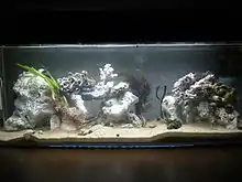 A marine aquarium is an aquarium that keeps marine plants and animals in a contained environment. Marine aquaria are further subdivided by hobbyists into fish only (FO), fish only with live rock (FOWLR), and reef aquaria. Fish only tanks often showcase large or aggressive marine fish species and generally rely on mechanical and chemical filtration. FOWLR and reef tanks use live rock, a material composed of coral skeletons harboring beneficial nitrogen waste metabolizing bacteria, as a means of more natural biological filtration.