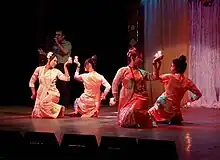 Marmas follow the Burmese calendar. They celebrate the New Year, called Sangrai (သင်္ကြန်), which begins on the first day of Bohag.[16] They make sangraimu, which is a form of traditional cakes. They take part in Sangrain Relong Pwe (သင်္ကြန်ရေလောင်းပွဲ; water pouring), where young Marma men and women spray each other with water. Sangrai is celebrated in three days, On the 1st day, called Painchwai or Akro, homes are decorated with flowers. On the 2nd day, Sangrai Akya, Marmas participate in traditional sports, dances, cultural activities and hold meetings regarding community issues. They also go to monasteries to participate in the Buddha statue's bathing (cleansing) ritual on this day. On the 3rd day, called Sangrai Atada, they cook a vegetable dish made out of more than 100 ingredients, called hangbong (ဟင်းပေါင်း; pachan in Bangla).[17]