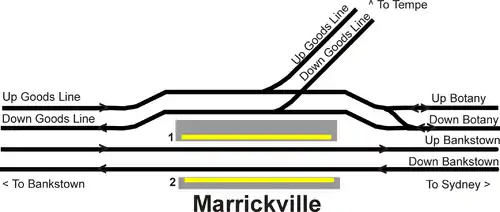 Marrickville railway station consists of one wayside platform to the south and an island platform to the north. Passenger rail only uses the south side of the island platform, with the Metropolitan Goods Line running on the north. The station buildings are original, as is the booking office at the western end of Platform 2. The station is accessed via stairs or lifts to both platforms from the concourse, or at a level entry onto Platform 2 from Station St. Illawarra Road is a major commercial shopping strip.[2]