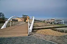 Among other things, you will find a children's playground and an outdoor gym, walking and cycling trails, as well as a car park with 30 spaces. There are 27 bicycle racks along the entire promenade. There are 13 viewing terraces with new trees and bushes planted. At one of them, opposite the Church of St. John the Baptist, there is the town's coat of arms laid out of cobblestone, as well as distances to the most important Polish and world cities and other patterns, such as fish (symbol of Christianity). A seasonal stall selling coffee and ice cream operates here as well.[6] There is a Floating Stage on the Vistula River attached to the promenade - chairs for spectators are erected opposite to it.[7][8]