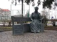 Maria Skłodowska-Curie bench in front of the building of the Chemical School Complex, 2019. - A historic house, currently the seat of the Voivodeship Labour Office in Toruń, branch in Włocławek, 5b Bulwary Street, built in 1950.