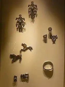 The hoard includes four anthropomorphic silver figurines of 'dancing men' (Ukrainian newspapers sometimes refer to them as 'aliens' for their unusual appearance[2]), five animal figurines, three fibulas, a radiate-head brooch, six armlets, tiaras, ear rings, neck rings, buckles, belt-fittings and horse harnesses. The style of figurines is sometimes considered as influenced by Huns, Bulgars or Avars.[3]