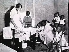 Beginning in the 1920s, midwives performed almost half of the births in the United States.[6] The Sheppard-Towner Act, introduced by the Children's Bureau, became effective November 23, 1921 following concerns of high infant mortality.[6] The act regulated hygiene, infancy care and put an emphasis on the licensure of midwives. The Act required nurses to supervise and train midwives. By 1929, the Sheppard-Towner Act was repealed, and the use of midwives had decreased to approximately 10% of births in the United States. More than half of the women using midwives were African American.[7] Black midwives were targeted for lack of cleanliness and lack of training.[7] Many black women were associated with dangerous and ignorance, even while midwives attended classes and were trained on the proper protocols of creating a safe birthing environment.[7] The Hill-Burton Act was introduced and became effective in 1946, it funded the construction of hospitals in areas that mostly used midwives. This shifted many pregnant women to use a hospital instead of at-home birthing methods.[7] The use of hospitals for child delivery increased from 27% to 96% by 1960.[7]