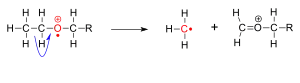 Fragmentation arises from a homolysis processes. This cleavage results from the tendency of the unpaired electron from the radical site to pair up with an electron from another bond to an atom adjacent to the charge site, as illustrated below.[7] This reaction is defined as a homolytic cleavage since only a single electron is transferred. The driving forces for such reaction is the electron donating abilities of the radical sites: N > S, O,π > Cl, Br > H.[11] An example is the cleavage of carbon-carbon bonds next to a heteroatom. In this depiction, single-electron movements are indicated by a single-headed arrow.