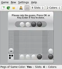 The codebreaker tries to guess the pattern, in both order and color, within eight to twelve turns. Each guess is made by placing a row of code pegs on the decoding board.[7]: 120 Once placed, the codemaker provides feedback by placing from zero to four key pegs in the small holes of the row with the guess. A colored key peg is placed for each code peg from the guess which is correct in both color and position. A white key peg indicates the existence of a correct color code peg placed in the wrong position.[9]