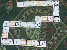 Matador (Spanish, "killer" or "bullfighter") or Matadore, sometimes called Russian Dominoes, is a domino game for two to four players using a double six set of dominoes.[1][2] It is one of the blocking family of domino games in which the object of the game is to be the first to go out, while blocking one's opponents from doing so. Its distinguishing feature is the unusual rule of playing tiles so as to combine pips instead of matching numbers.