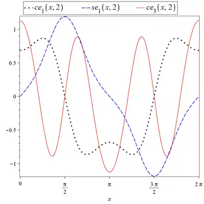 In some usages, Mathieu function refers to solutions of the Mathieu differential equation for arbitrary values of and . When no confusion can arise, other authors use the term to refer specifically to - or -periodic solutions, which exist only for special values of and .[5] More precisely, for given (real) such periodic solutions exist for an infinite number of values of , called characteristic numbers, conventionally indexed as two separate sequences and , for . The corresponding functions are denoted and , respectively. They are sometimes also referred to as cosine-elliptic and sine-elliptic, or Mathieu functions of the first kind.