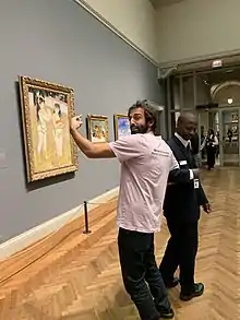 Geller has organized a campaign against the artist Pierre-Auguste Renoir both online and through various protests.[6] In February 2015, Geller created the Instagram account and began posting images of paintings by Renoir, with captions criticizing both the artist and the institutions that hang his art.[16] In May 2015, Renoir's great-great-granddaughter responded to one of the Instagram posts, entering into an argument with Geller, garnering some media attention.[17][6] On October 5, 2015, Geller organized an anti-Renoir protest outside the Museum of Fine Arts Boston.[18] The protest garnered criticism in the Boston Globe by Sebastian Smee, a Pulitzer prize-winning art critic, and Geller responded by publicly challenging Smee to a duel.[19] The feud gained media attention, especially after a second protest outside the Metropolitan Museum of New York.[4][20] Geller continued to organize anti-Renoir protests at art museums in major cities around the country.[21] After a protest at the Art Institute of Chicago, Geller was a guest on a local news station, where he expanded the focus of his movement from Renoir's paintings themselves to the misogyny and white supremacy of the canon at large. "At the end of the day," he said, "it’s about access, who has access to our museums... I think the Art Institute should sell some of these Renoirs...and instead buy some art that is painted by women or people of color."[22]