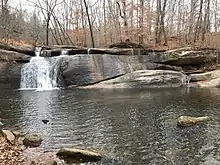 The park's Deshazo Mill access is its northernmost and second-developed area. The access has a small parking and picnic area, which serve as the trailhead for the Mayo River Trail.[4] The trail takes hikers past Fall Creek Falls, before reaching the Mayo River.[4] The trail then turns north and passes by the confluence of the North and South Forks of the Mayo, and it formally ends at Bryd's Ledge. Named for Mr Bryd, the rock formation in the North Mayo River was a landmark when the North Carolina–Virginia state line was surveyed.[4] An informal trail continues on into Virginia's Mayo River State Park.