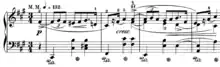 The second mazurka of the set, in C-sharp minor, is quite an outwardly dance-like piece, with a triple meter and bass line characteristic of a waltz. It starts with a slow introduction characterised by the play between the inner voices. The principal theme, returning a couple of times, although in slightly altered form, has a lyrical and almost melancholy character. The second theme makes use of the Lydian mode. The trio section provides a contrast with a more joyous theme. This then quickly fades into the opening introduction measures and the mazurka ends after the main theme is repeated twice. It lasts around two and a half minutes.[3]