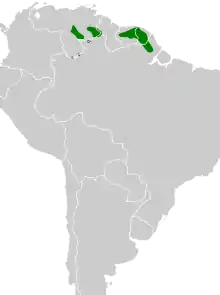 McConnell's spinetail has a disjunct distribution. The nominate subspecies is found on the tepuis of southern Venezuela, far western Guyana, and extrene northwestern Brazil. Subspecies S. m. obscurior is found in the lowlands of Suriname, French Guiana, and northeastern Brazil.[2][7][3] The species inhabits the edges of montane and lowland evergreen forest, secondary forest, and in French Guiana some riparian forest. It favors dense undergrowth. In the tepui region it occurs at elevations between 1,000 and 1,900 m (3,300 and 6,200 ft); in the east it is mostly found from near sea level to about 1,000 m (3,300 ft).[11][12]