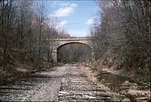 McMickle Cut is the longest cut on the Lackawanna Cut-Off railroad line in northwest New Jersey. It was built between 1908 and 1911 by contractor Timothy Burke between mileposts 47.1 and 48.1 where Stanhope and Byram Township meet. Some 600,000 cubic yards of material was removed by dynamite and other methods to make the cut, which is 1.04 miles (1.7 km) long, has an average depth of 29 feet (8.9 m), and a maximum depth of 54 feet (16.6 m). [1]