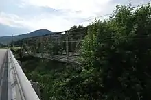 The Meadow Bridge was a historic bridge across the Androscoggin River located on a spur of North Road in Shelburne, New Hampshire. It was a multi-span pin-connected truss bridge that was the first on its site when it was built in 1897 by the Groton Bridge and Manufacturing Co. The bridge consisted of three central through Pratt trusses, one pony Pratt truss, and one steel girder section. The ends of the bridge rested on stone abutments, while the interior spans were supported by circular steel piers filled with concrete and anchored in place by timber piles. The bridge was bypassed in 1984 by a modern bridge.[2] In 2004 it was dismantled and stored on the banks of the river for future rehabilitation.[3]