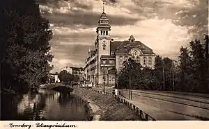 In November 1897, the Prussian Ministry of Trade and Crafts stated to be ready to participate in the cost of the establishment of schools by the state. In that direction, the building at Konarski street was dedicated in 1900 to courses for craftsmen. Eventually, in the early 1908, an agreement was signed to start the construction of a new school. The construction site allocated was bought by the municipality from a private owner for 43 000 German gold marks. Construction and design planning of the nearby area was paid by the government. Designers chosen for the building were the architects Otto Brech and Carl Meyer. Construction works began in 1910 in the then Berlin street (now Świętej Trójcy Street), and were completed one year later.[2] The edifice has been designed on a grand scale and was standing in an attractive location, overlooking the Bydgoszcz Canal, as a showcase, in view of the headquarters of the artistic direction of Bromberg university.