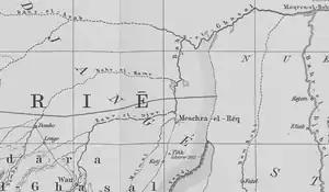 The Rek were the first to ally themselves with the Khartoum ivory merchants and to supply porters, although the Dinka in general were hostile to the Sudanese.[1] Early in October 1856 the merchant Ali Amouri passed through Mechra el Rek accompanied by Zobeir. They crossed the land of the Dinkas and a few days later reached the land of the Diour people, where Ali Amouri had a station called Ashur, the name of the sheikh of the district.[2] Zobeir returned to Khartoum in October 1858 with a capital of 1,000 Egyptian pounds, his share of the company's profits. He bought a boat, a large quantity of goods and assembled a large troop armed with rifles. He reached Mechra el Rek without incident, despite the obstacles the Sudd presents to navigation. He hired some local porters and left by land for Bahr el Ghazal, planning to explore land that traders had not yet reached.[3]