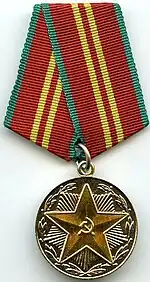 The Medal "For Impeccable Service" (Russian: Медаль «За безупречную службу») was a Soviet military award for long service awarded to deserving members of the military personnel of the armed forces of the USSR, of the Interior Ministry of the USSR and of the Ministry for the Protection of Public Order of the USSR, to recognise ten, fifteen and twenty years of faithful and impeccable service to the state.