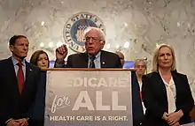 Sept. 13, 2017. Senator Bernie Sanders (I-VT) speaks in favor of Medicare for All. Senator Kirsten Gillibrand (D-NY) is standing to his left.