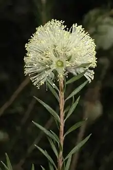 The flowers are cream-colored and grouped in a short spike or a head at the ends of the branches which continue to grow after flowering. Each head contains 3 to 15 flowers and can be as large as 35 mm (1 in) in diameter. The stamens are arranged in five bundles around the flower and there are 15 to 33 stamens in each bundle. Flowering occurs between October and December and is followed by fruit which are woody capsules. These are spherical to urn-shaped, about 5–7 mm (0.2–0.3 in) long and arranged in loose clusters along the stem.[2][3][4][5]