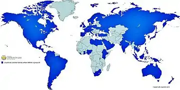 Congregations are grouped geographically by divisions, districts and zones mainly the Philippines, South America,[26] North America, Canada,[27] Asia Oceania,[28] Middle East,[29] Europe, Israel and Africa Division.[30] The official website of the church reported its presence in 46 countries and territories as of 2010.[31]