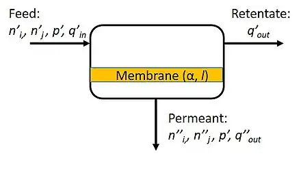 In a typical membrane system the incoming feed stream is separated into two components: permeant and retentate. Permeant is the gas that travels across the membrane and the retentate is what is left of the feed. On both sides of the membrane, a gradient of chemical potential is maintained by a pressure difference which is the driving force for the gas molecules to pass through. The ease of transport of each species is quantified by the permeability, Pi. With the assumptions of ideal mixing on both sides of the membrane, ideal gas law, constant diffusion coefficient and Henry's law, the flux of a species can be related to the pressure difference by Fick's law:[4]