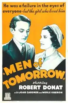 Men of Tomorrow is a 1932 British drama film directed by Zoltan Korda and Leontine Sagan, produced by Alexander Korda and written by Anthony Gibbs and Arthur Wimperis. It stars Maurice Braddell, Joan Gardner and Emlyn Williams and features Robert Donat's movie debut.[1][2] Robert Donat and Merle Oberon were given top billing when Men of Tomorrow was distributed in the United States in 1935.