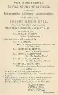 In 1840 Edward Everett spoke to the association on "Accumulation, Property, Capital, Credit."[7] In 1844 Ralph Waldo Emerson gave a lecture entitled "The Young American."[8] In 1847 Charles Sumner spoke on "White Slavery in the Barbary States."[9] In 1849, Horace Mann addressed the association’s 29th Anniversary with a, “A Few Thoughts for a Young Man.”[10] Other speakers included Oliver Wendell Holmes Sr.;[11] poet Park Benjamin Sr.; George S. Boutwell; Thomas Greaves Cary; Rufus Choate; Caleb Cushing; George Stillman Hillard; William F. Sturgis; and Robert Charles Winthrop.[12]
