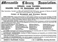 The Mercantile Library Association (1820-1952) of Boston was an organization dedicated to operating a subscription library, reading room and lecture series. Members included James T. Fields and Edwin Percy Whipple.[1] Although the association had a relatively long history, its heyday occurred in the mid-19th century, particularly the 1840s and 1850s.[2]