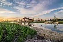 The park holds restrooms, two shelters, picnic tables, a pond and fountain, a mural, and some trails.[3] A sculpture walk was incorporated in 2018 as part of a private community-driven fundraising effort. The park was funded as part of a large Federal Community Development Block Grant awarded to the city after the disaster.