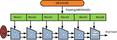 To make it resistant against the length extension attack, the message length is added in an extra block at the end (shown with yellow background color):