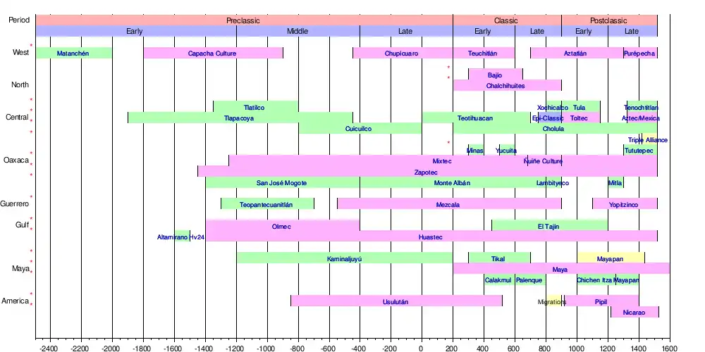 Mesoamerican civilisation was a complex network of different cultures. As seen in the time-line below, these did not necessarily occur at the same time. The processes that gave rise to each of the cultural systems of Mesoamerica were very complex and not determined solely by the internal dynamics of each society. External as well as endogenous factors influenced their development. Among these factors, for example, were the relations between human groups and between humans and the environment, human migrations, and natural disasters.